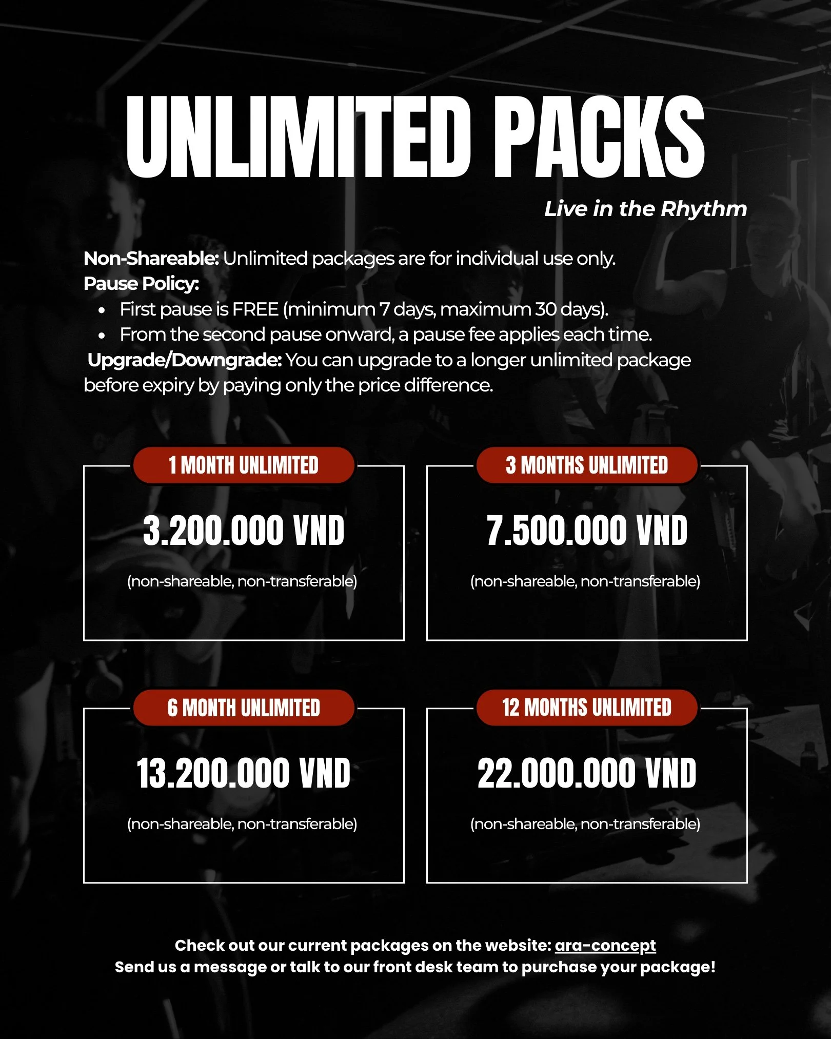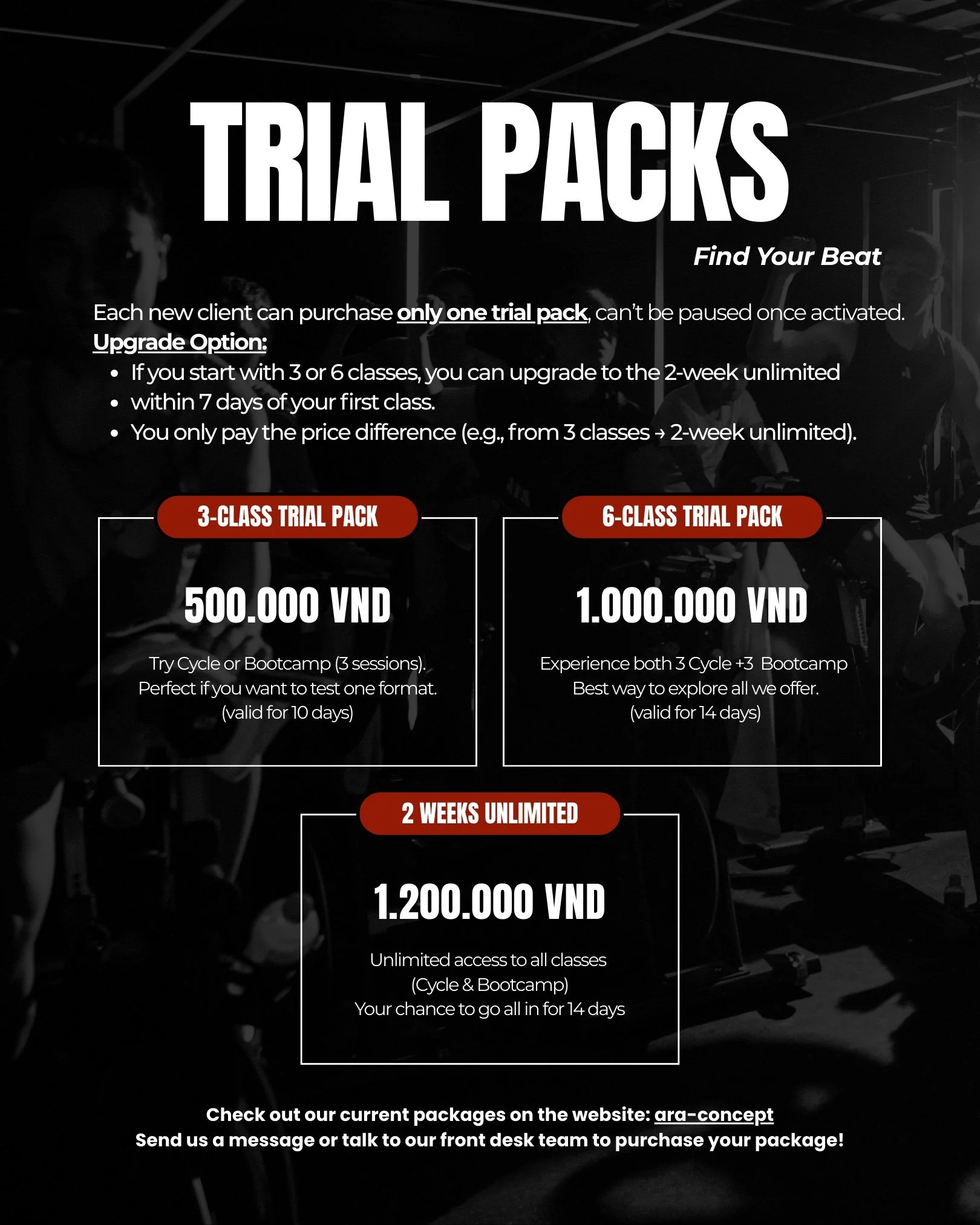 Pay via cash, bank transfer (Vietnamese bank only), or credit card in the studio to purchase your package.